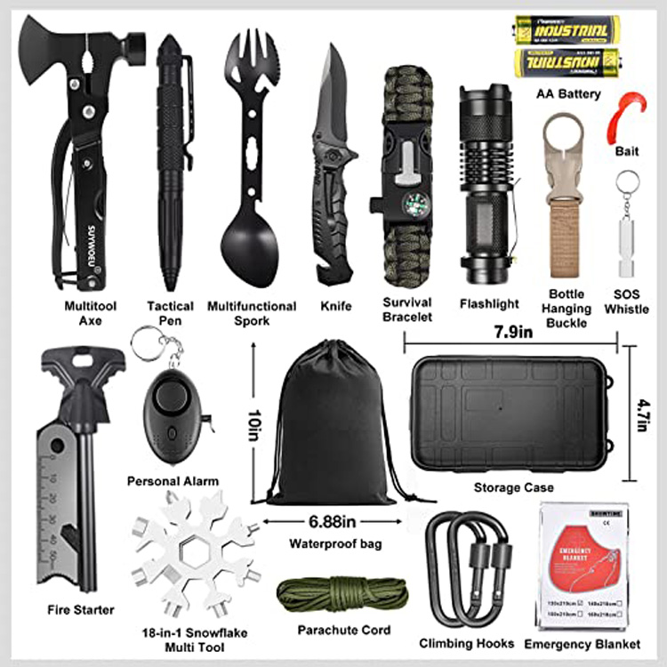 ·✅【تجهیزات و تجهیزات ضروری بقا】 همه چیز با کیفیت است. شما دریافت خواهید کرد: 14 در 1 هچت، 18 در 1 ابزار چند دانه برفی، قلم تاکتیکی، چاقوی بقا، چنگال قاشق چند منظوره، دستبند بقا، چراغ قوه، سوت، دستبند بقا، گیره بطری آب، پتوی اضطراری، طناب چتر نجات، 2 عدد , زیر جیبی , خراش سنگ چخماق , 2 عدد چوب براق , لوازم ماهیگیری , 2 عدد باتری قلمی و جعبه ضد آب .