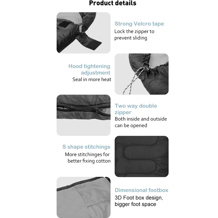 شکل جادار به سبک پاکت، فضای پا سخاوتمندانه ای را ارائه می دهد و امکان حرکت راحت در هنگام خواب را فراهم می کند، در حالی که طراحی ارگونومیک هود باعث حفظ گرما در اطراف سر و شانه ها می شود.