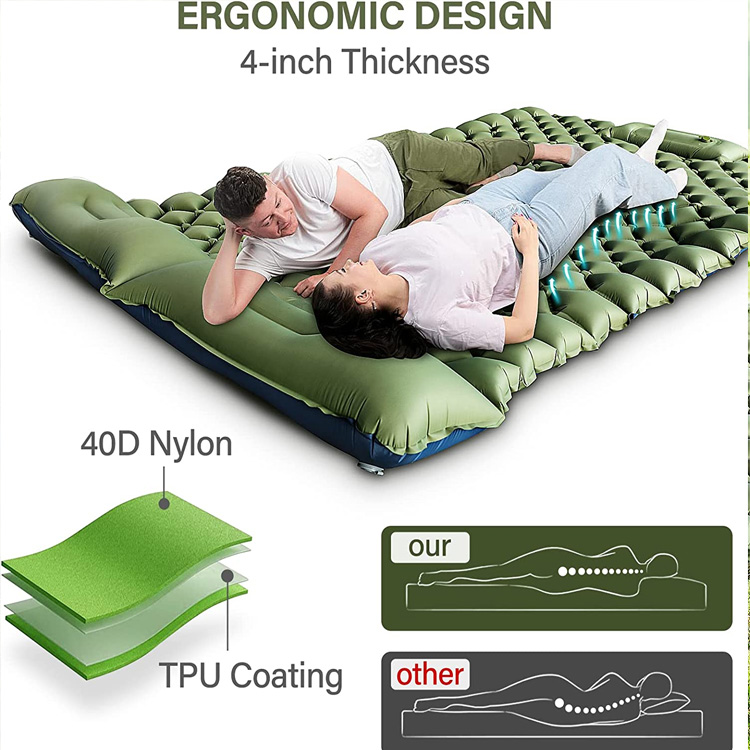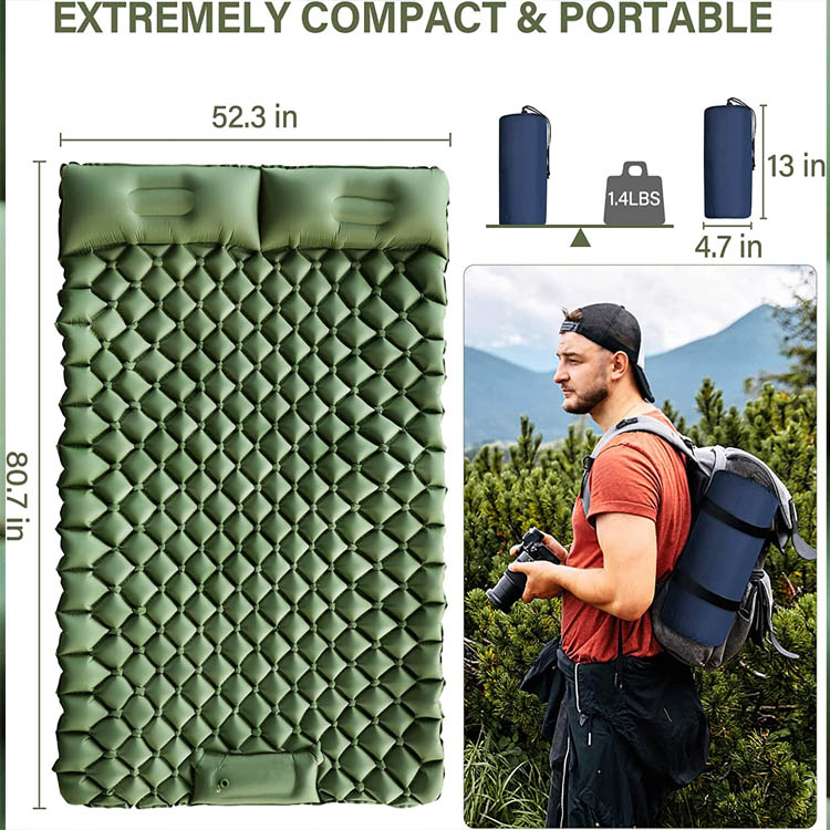 پد خواب کمپینگ دو نفره پد کمپینگ بادی. راحتی دو نفره برای ماجراجویی در فضای باز. این پد کمپینگ بادی دو نفره، فضای خواب وسیعی را با طراحی مبتکرانه نگهدارنده پا برای جلوگیری از سر خوردن ارائه می دهد. به عنوان یک راه حل فوق العاده سبک، قابلیت حمل بی نظیر و راحتی مشترک را برای زوج ها و دوستان کمپینگ ارائه می دهد.