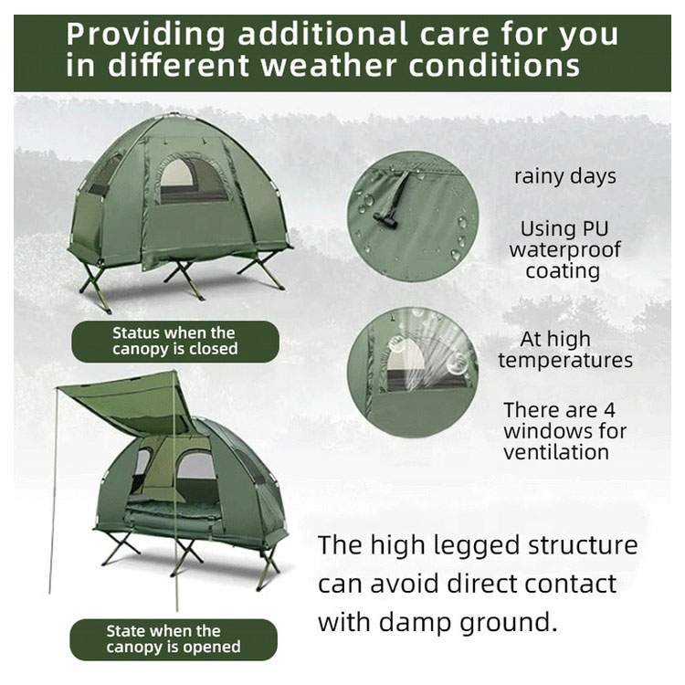 دارای یک پلتفرم خواب تعبیه شده و مرتفع است که حفاظت ضد رطوبت را با راحتی بیشتر ترکیب می کند و به طور موثر شما را از زمین مرطوب جدا می کند و عایق را بهبود می بخشد.