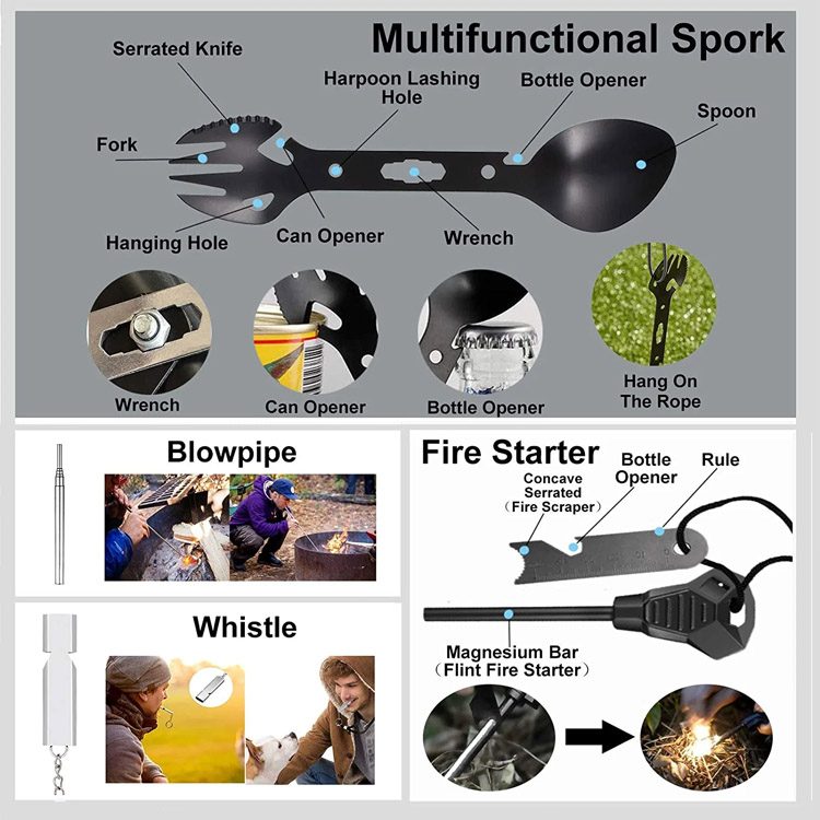 این کیت همه کاره به دقت برای سناریوهای همه کاره طراحی شده است، حاوی ابزارهای ضروری برای کمپینگ در بیابان، سفرهای پیادهروی طولانی، گردشهای ماهیگیری، و اکسپدیشنهای شکار بازیهای بزرگ.